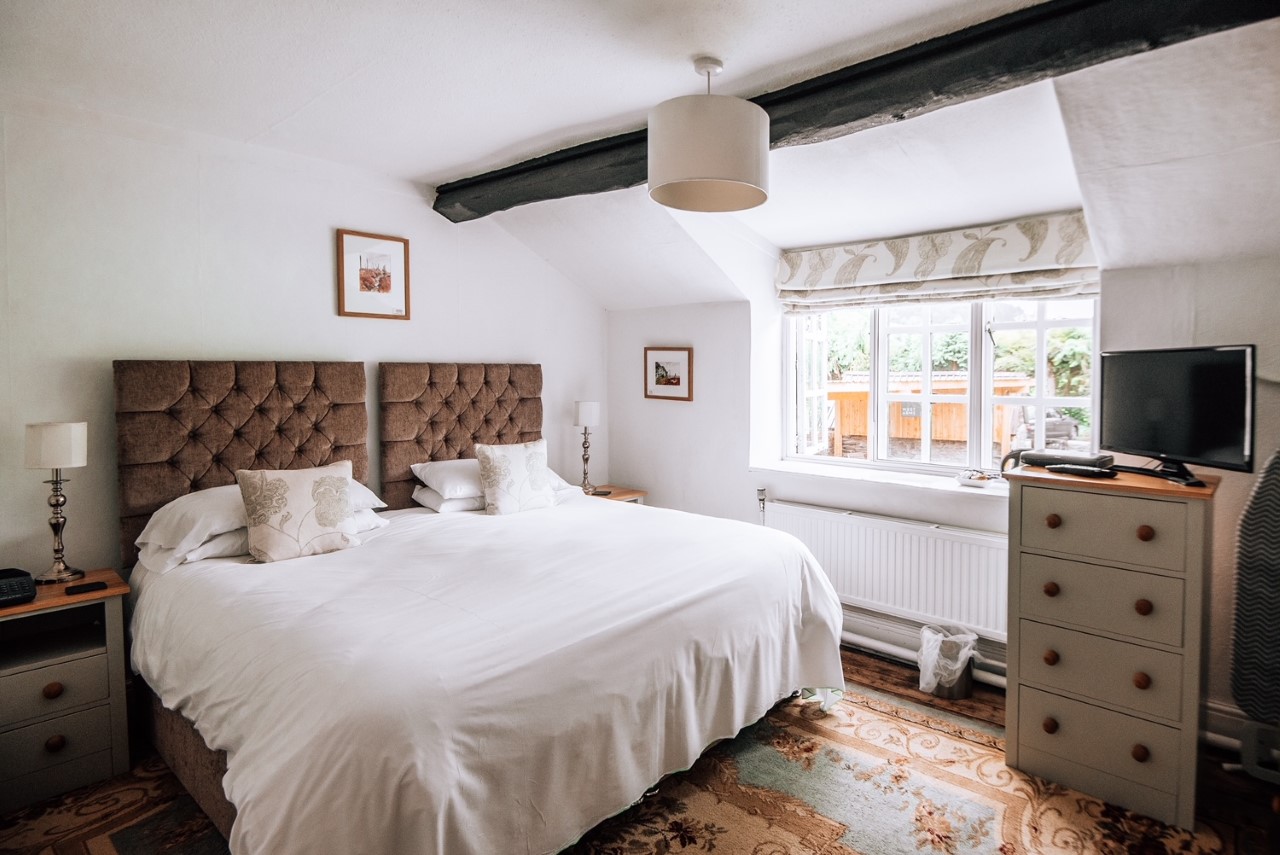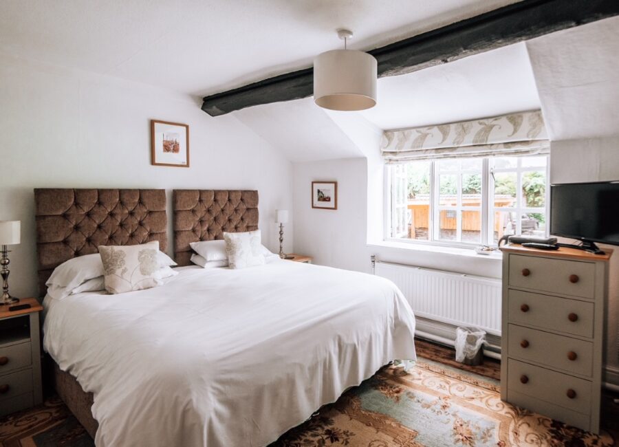 Black and white painted outside and bedecked with creeper and summer flowers, it’s a haven of comfort within, the tone set by roaring log fires, slate floors, stripped low beams, antique furnishings, and welcome touches like jugs of fresh flowers, church candles, soft lamplight, and a huge welcome for our four-legged friends. Colourful artwork by Rosie Davies, whose studio is across the road, adorn the walls.