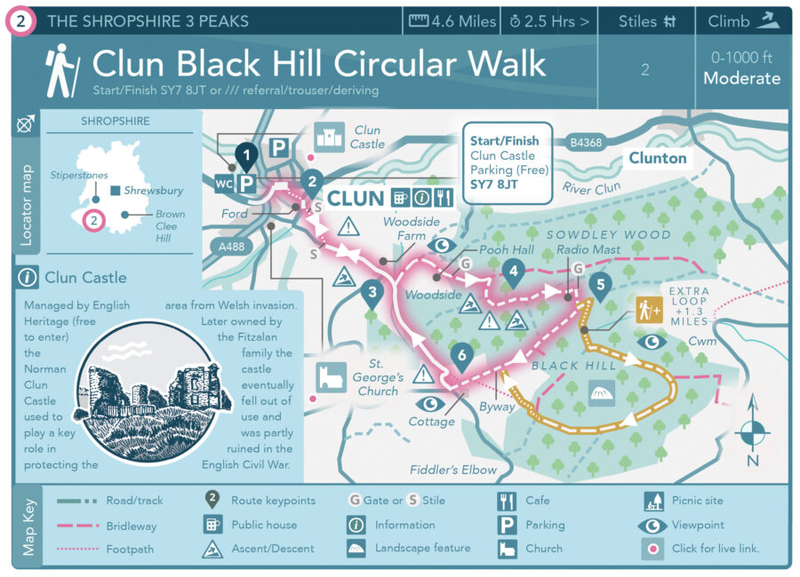 Starting from Clun Castle car park, this 4.6 mile circular route will take you approximately 2.5 hours to complete (possibly slightly longer have little legs joining you).