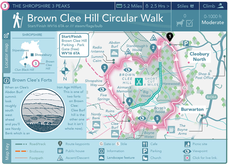 Starting at the car park, this circular walk is 5.2 miles long and takes approximately 2.5 hours to complete. You’ll be conquering Shropshire’s highest peak, at 540m in elevation.