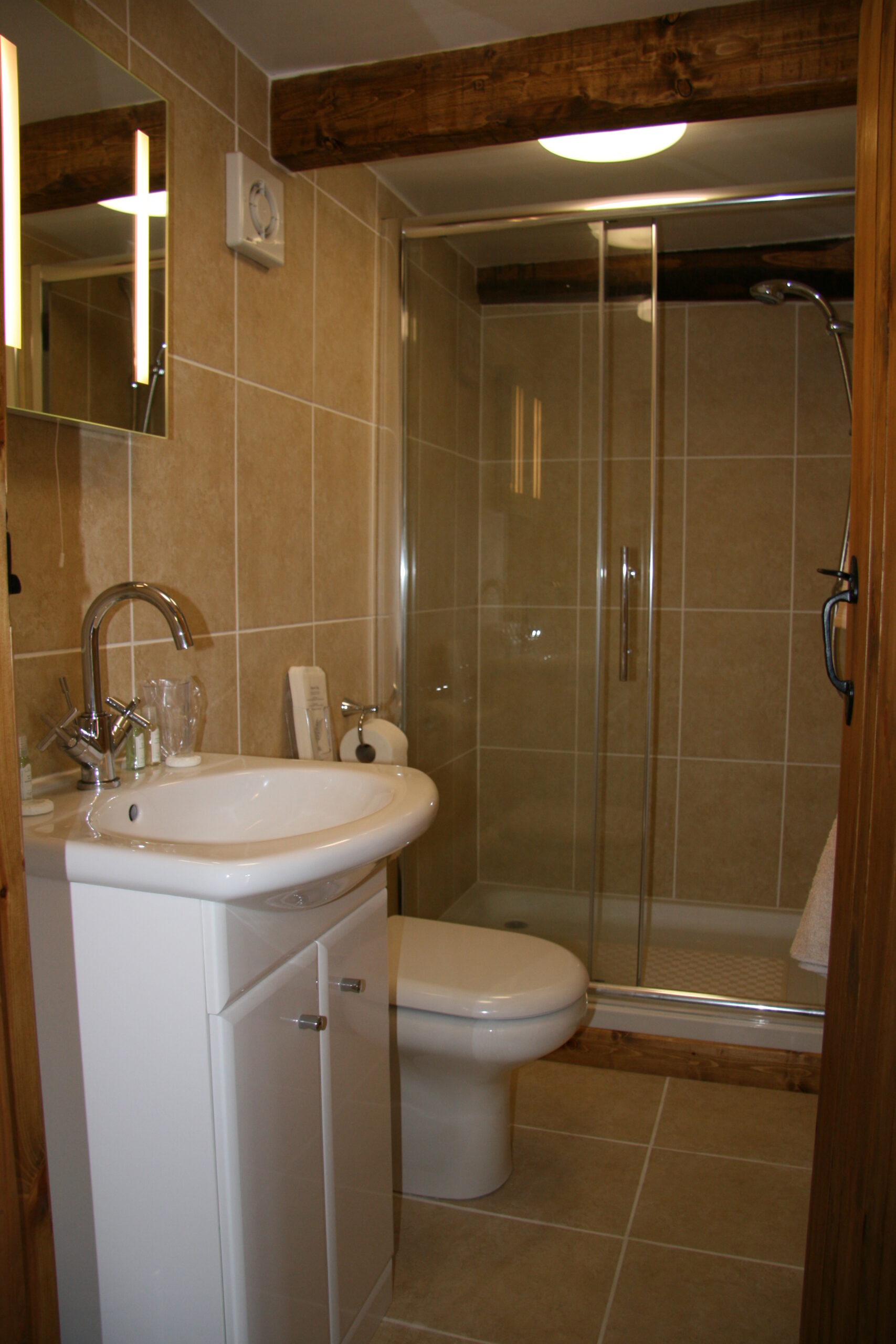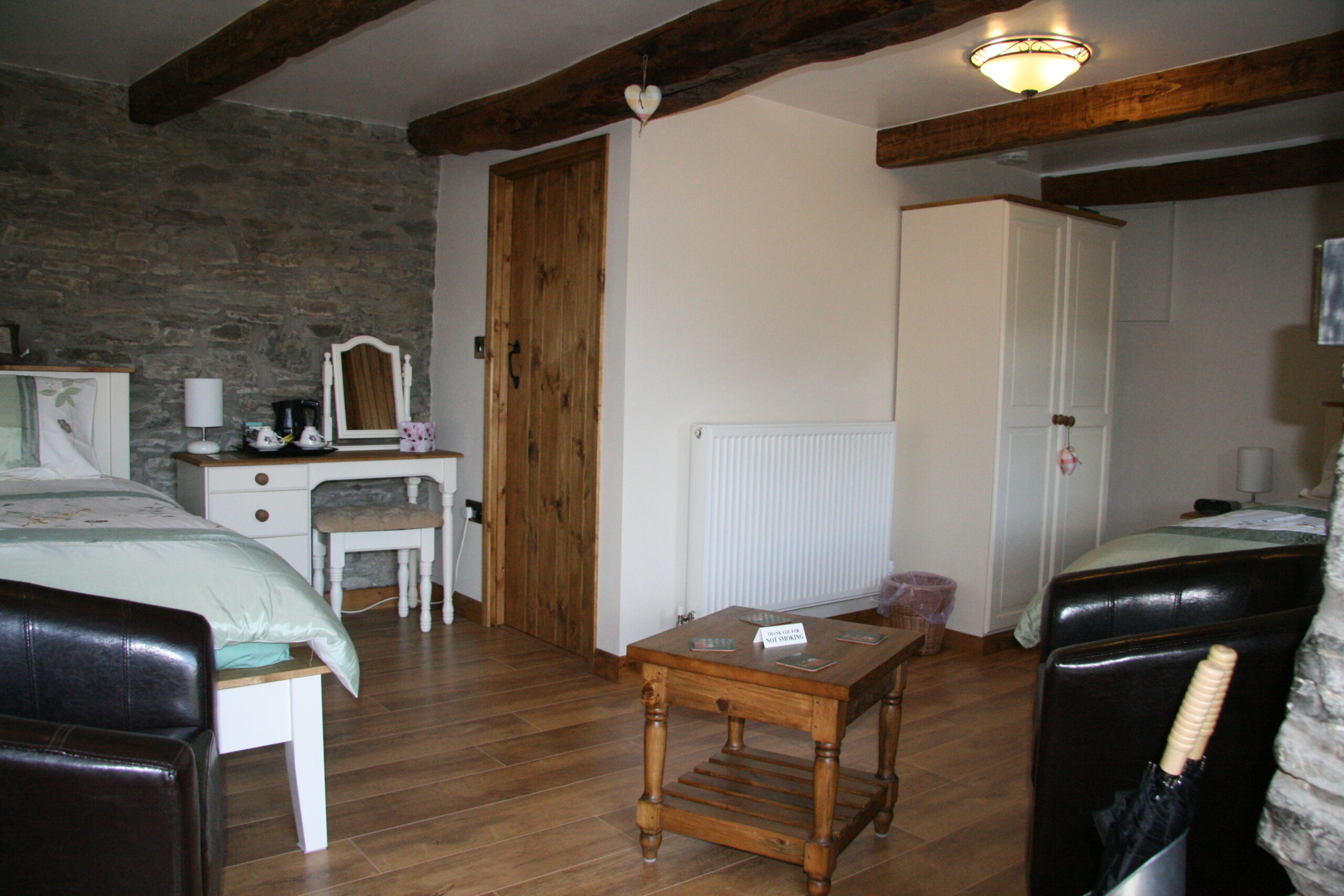 The Granary is a ground floor twin en-suite with exposed beams and stone work. There are pleasant views over the garden. The en-suite has a toilet, wash basin and a large luxury shower. Again a large room with plenty of space to sit in peace and quiet. Coffee and tea making facilities. There is direct access through a half glazed door to the garden.