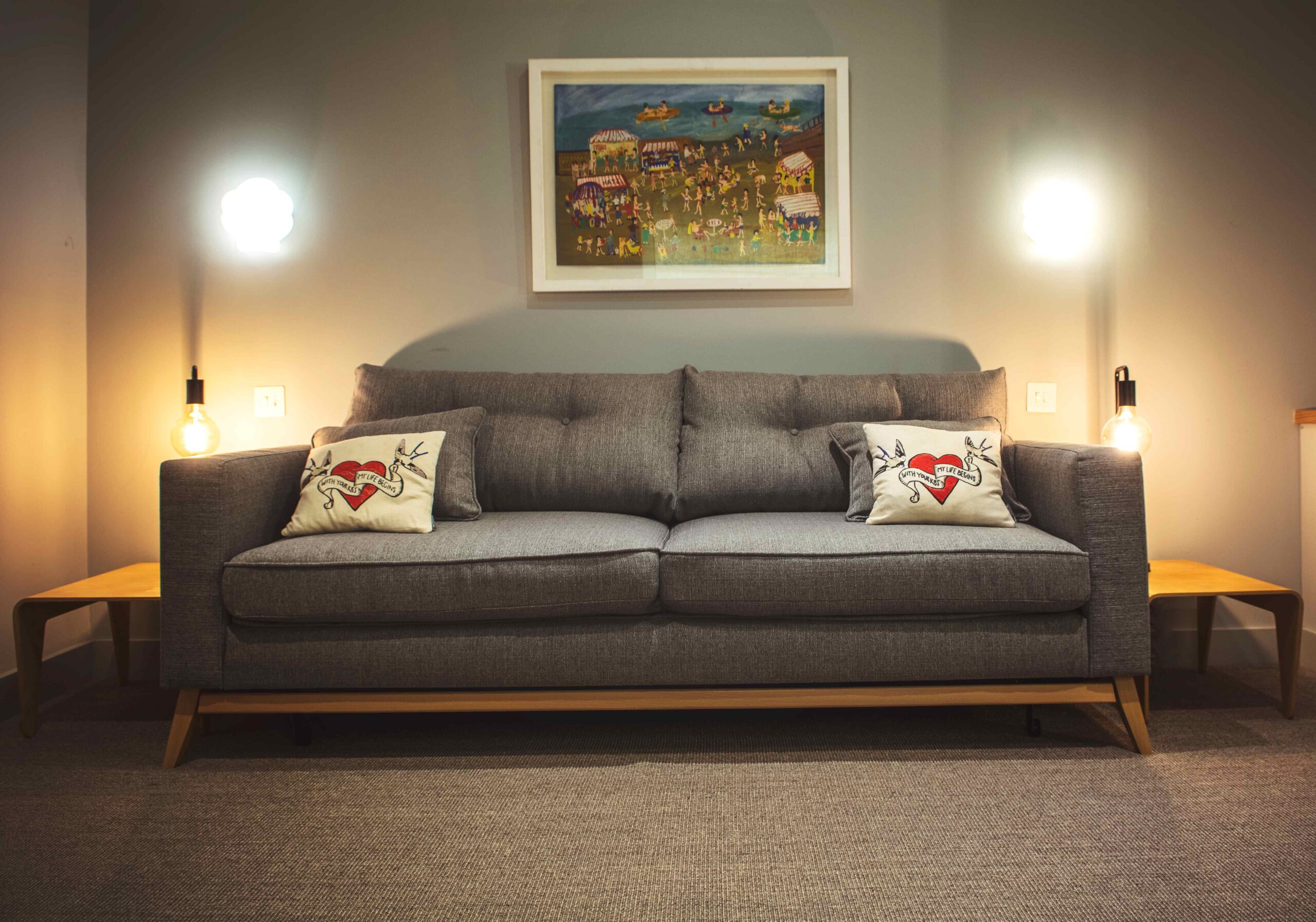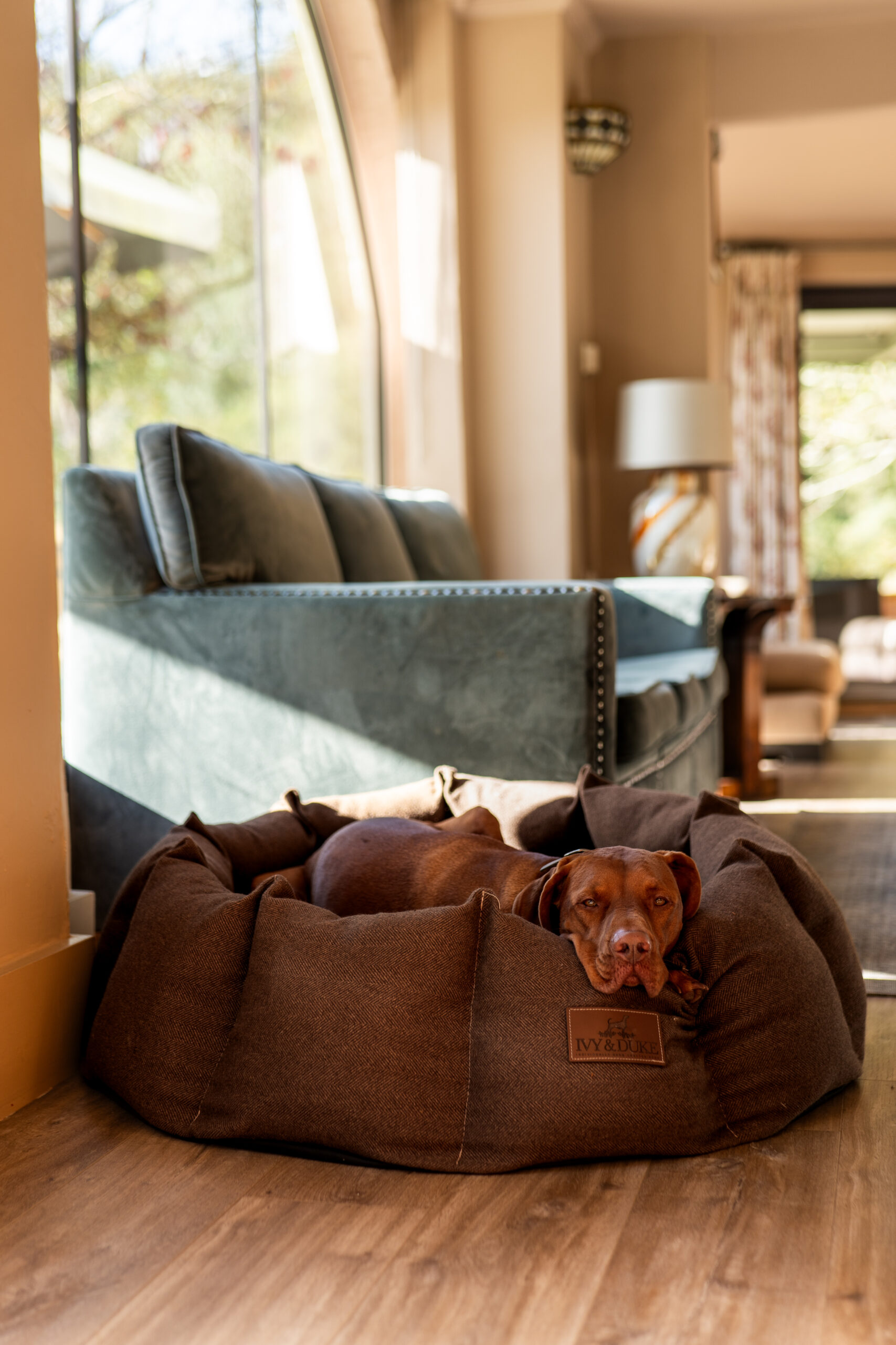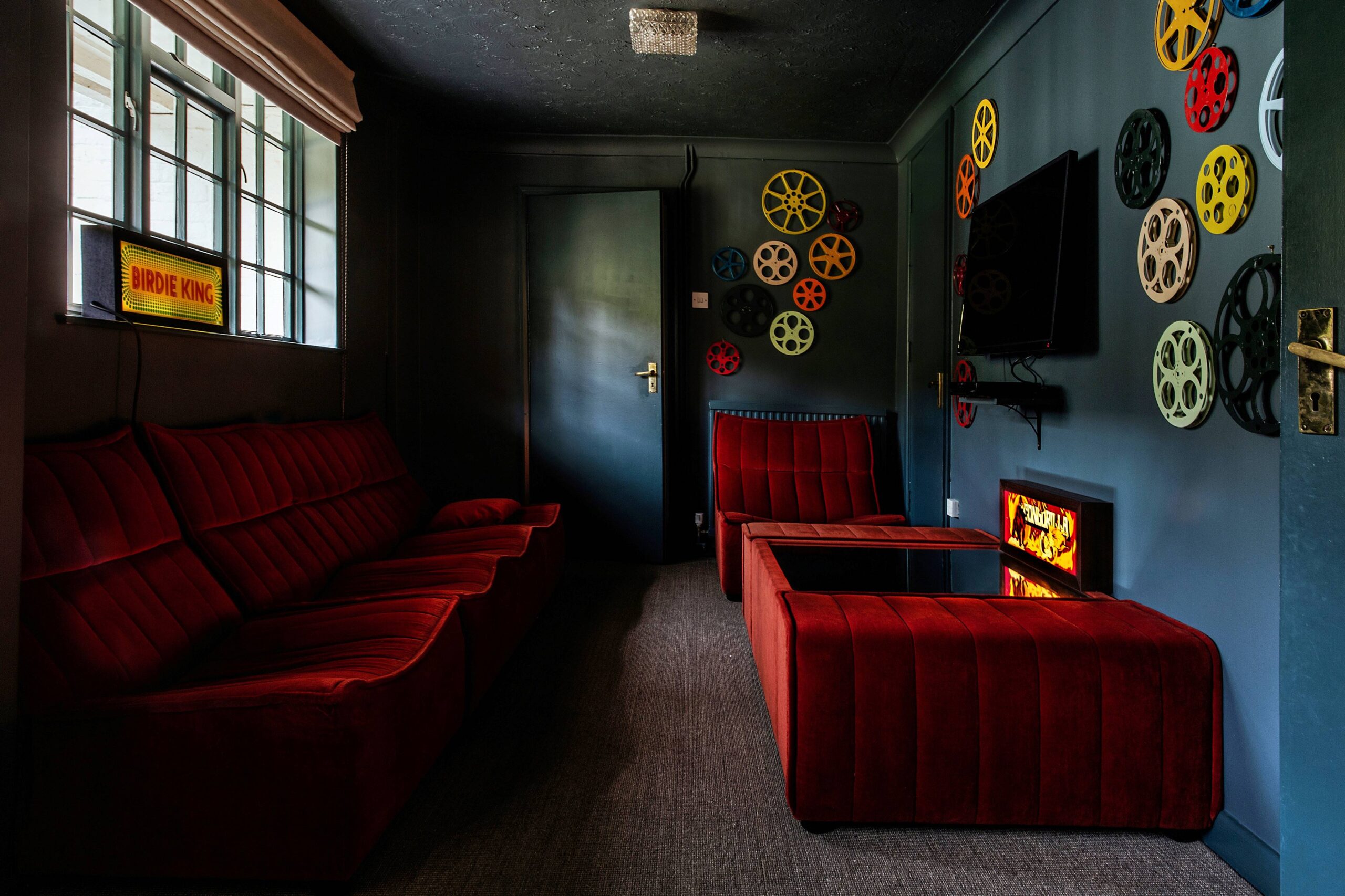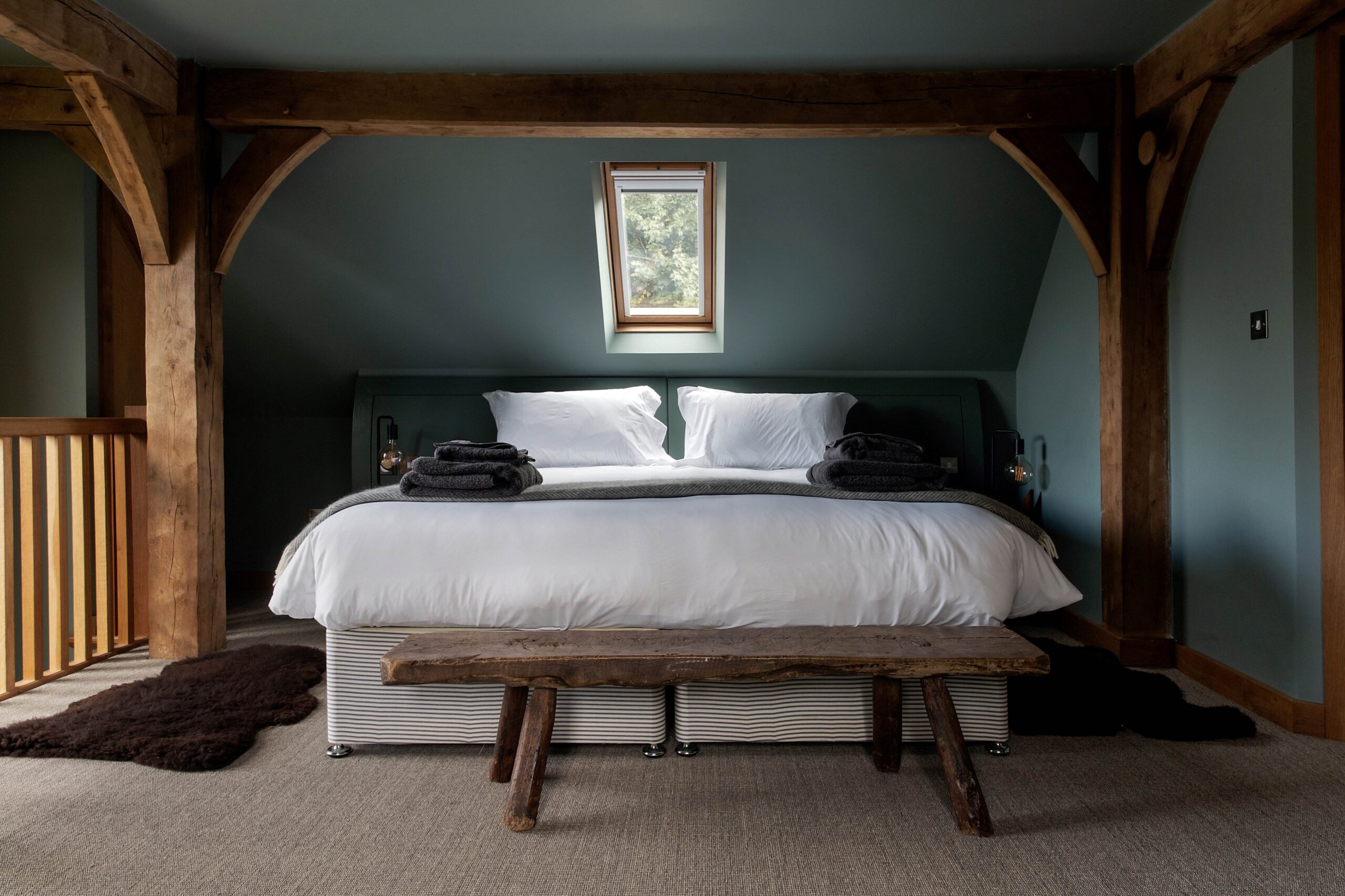 This beautiful space has been designed for big groups to socialise and relax together. The inviting layout features multiple communal areas, including a huge living and dining room. Here, floor-to-ceiling windows provide lots of natural light and stunning views across the courtyard and river. A dining table to seat 14 waits for banquets to be served, and guests can enjoy an after-dinner tipple in the adjacent bar area. Whilst adults unwind, kids can hang out and watch a film in ‘The Den’, a cosy snug with comfy sofas and a TV.