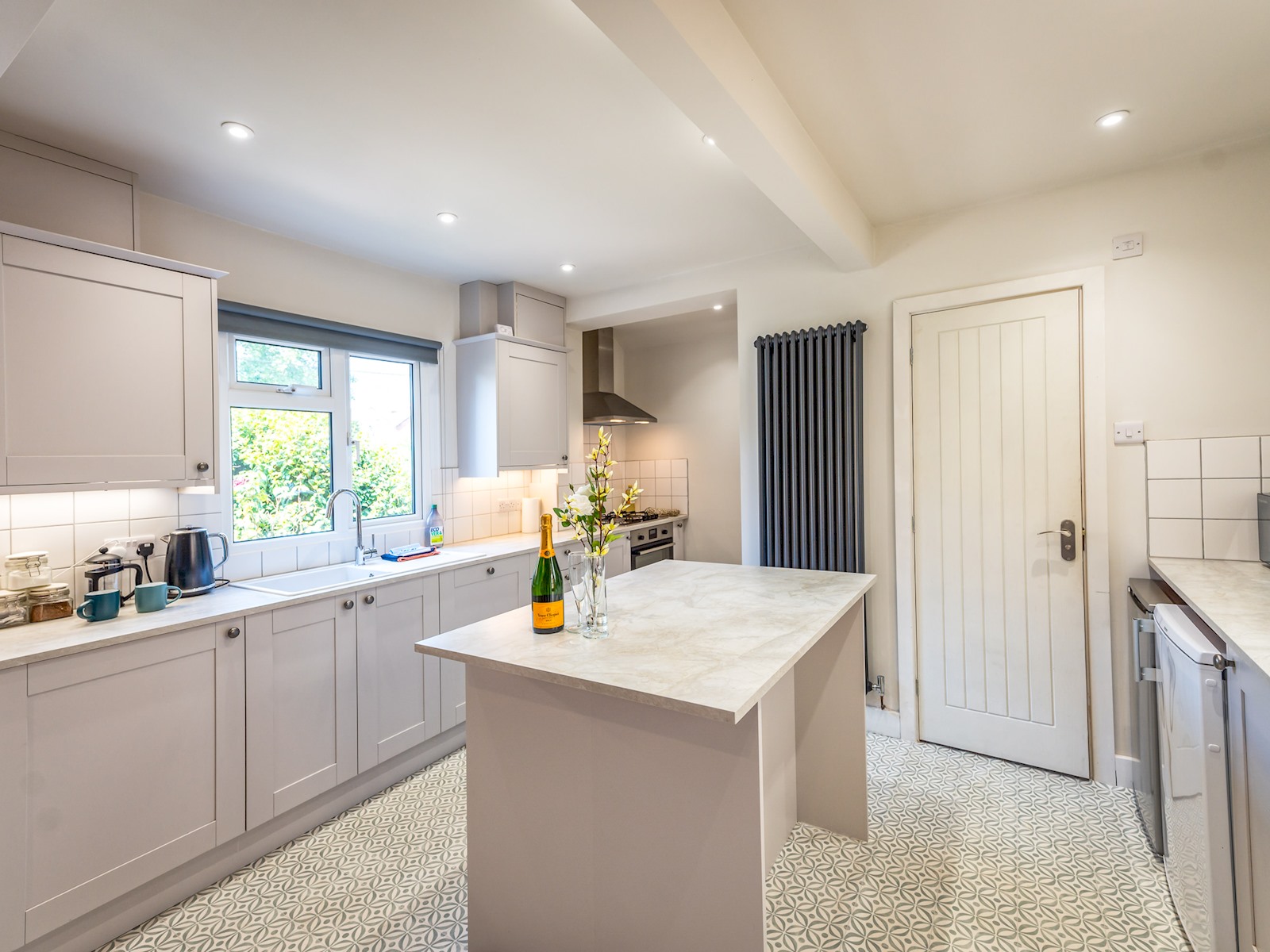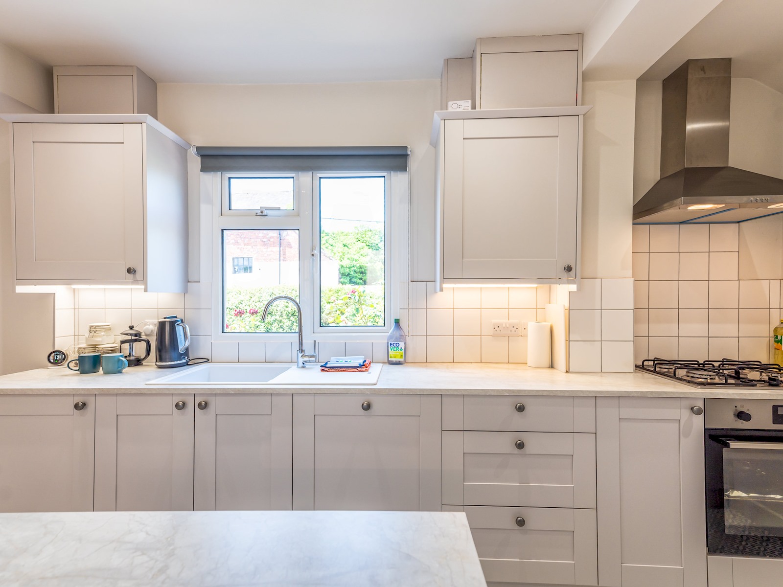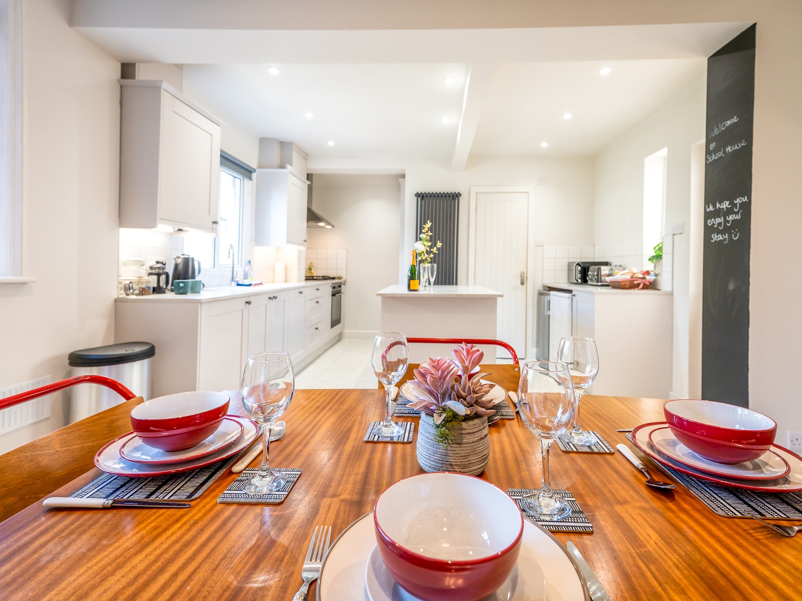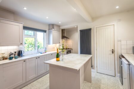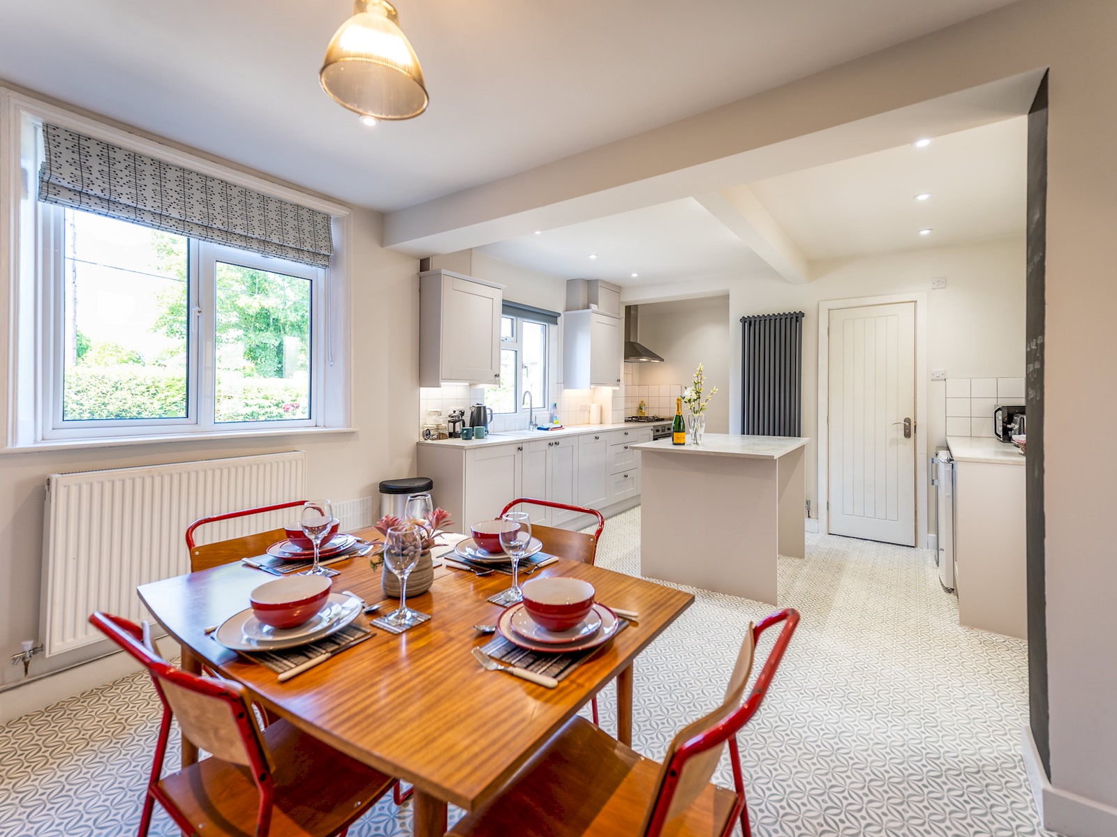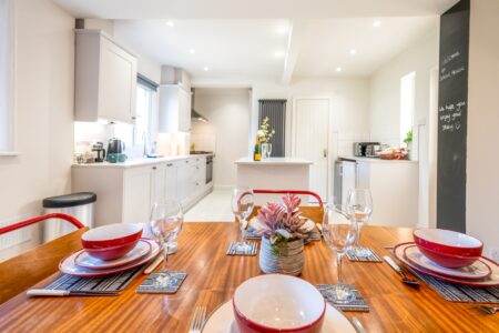 We have an bright and airy open plan kitchen (with island unit) which is fully equipped with appliances and amenities, and a dining area which is great for sharing with friends and family over meals and drinks.