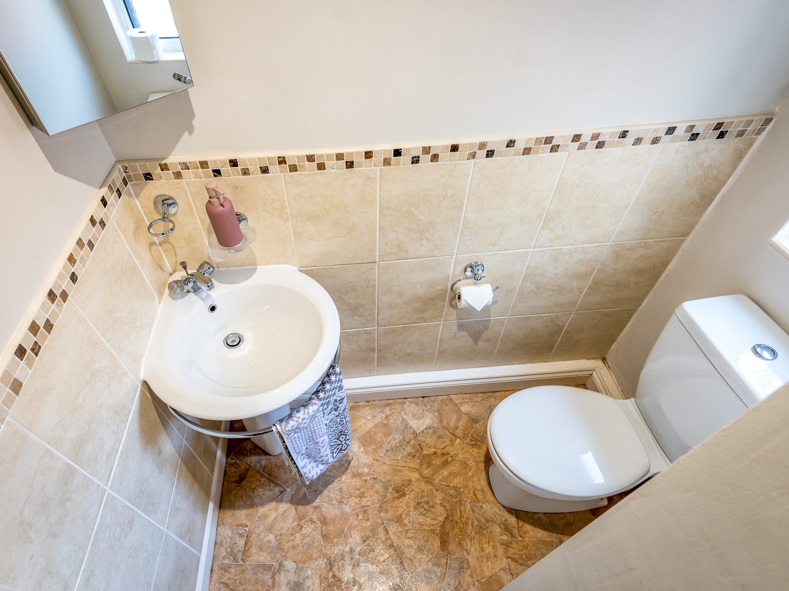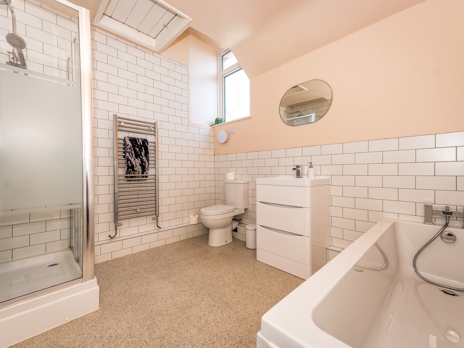 Upstairs is a spacious and modern main bathroom upstairs with separate shower cubicle and bath also with mixer shower tap.