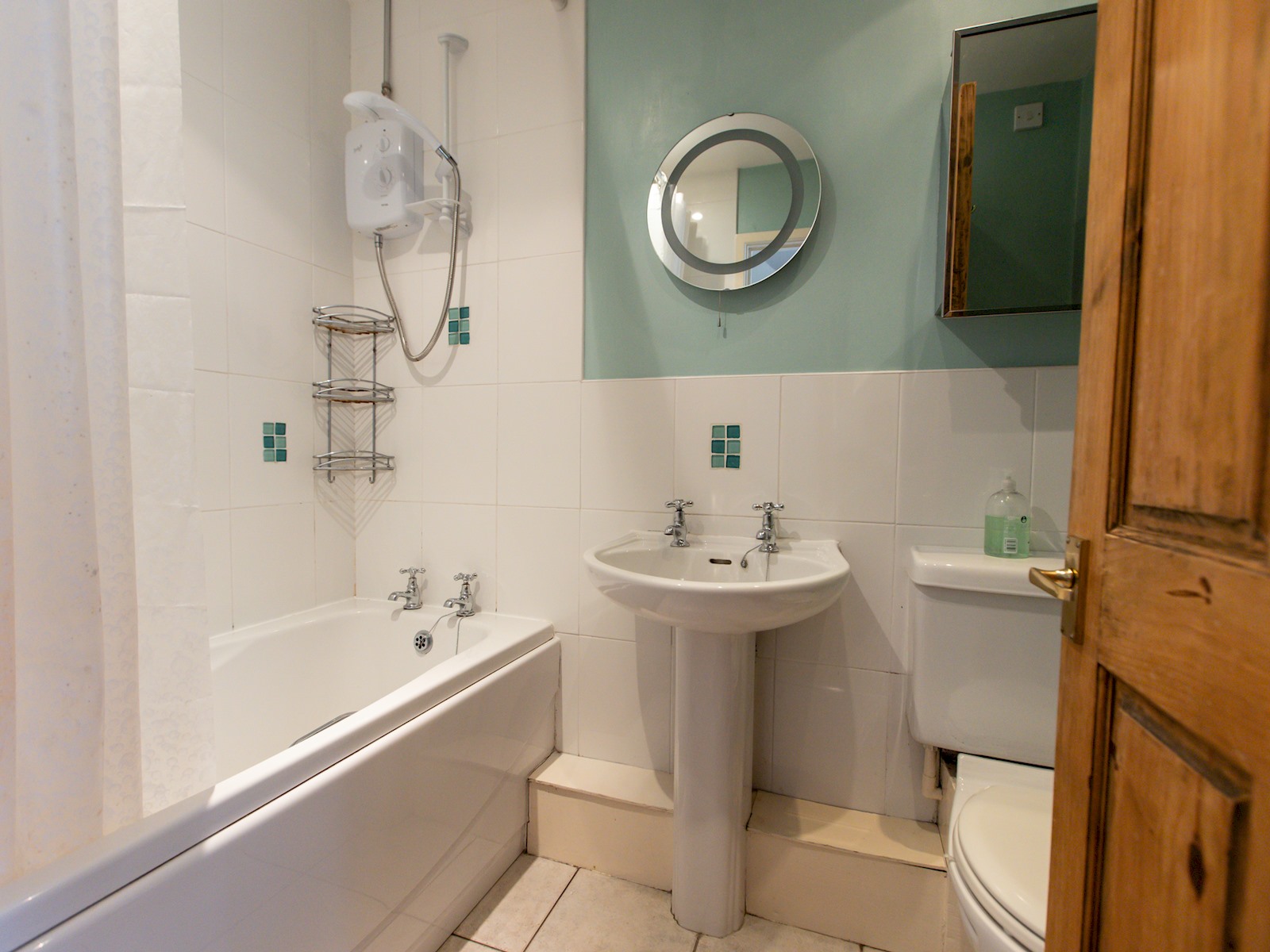 The bathroom is downstairs with a shower over the bath.