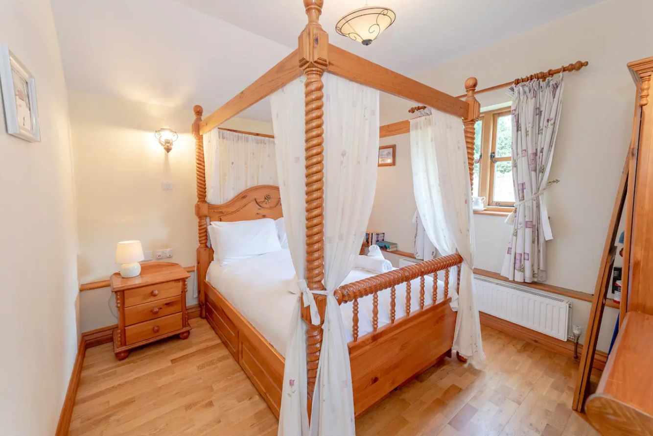 Enter the bedroom, where a stunning four-poster bed crafted in oak awaits you. This exquisite bed promises restful nights and a touch of romance, making it the perfect retreat for couples seeking an intimate getaway.