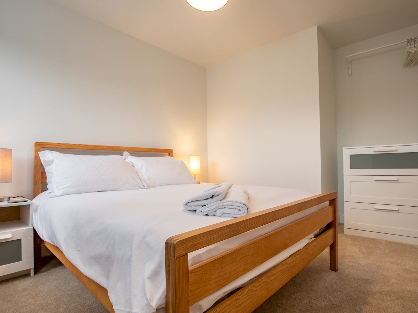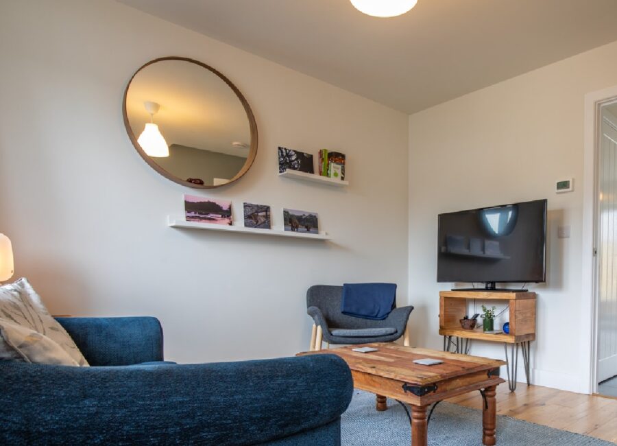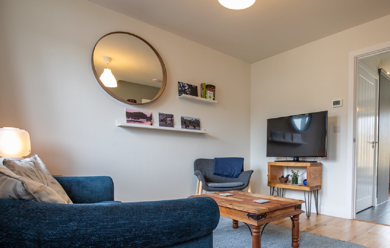 Stairs from the lounge lead to two double bedrooms, one with a king-size bed and the second with a double. Both rooms have storage.