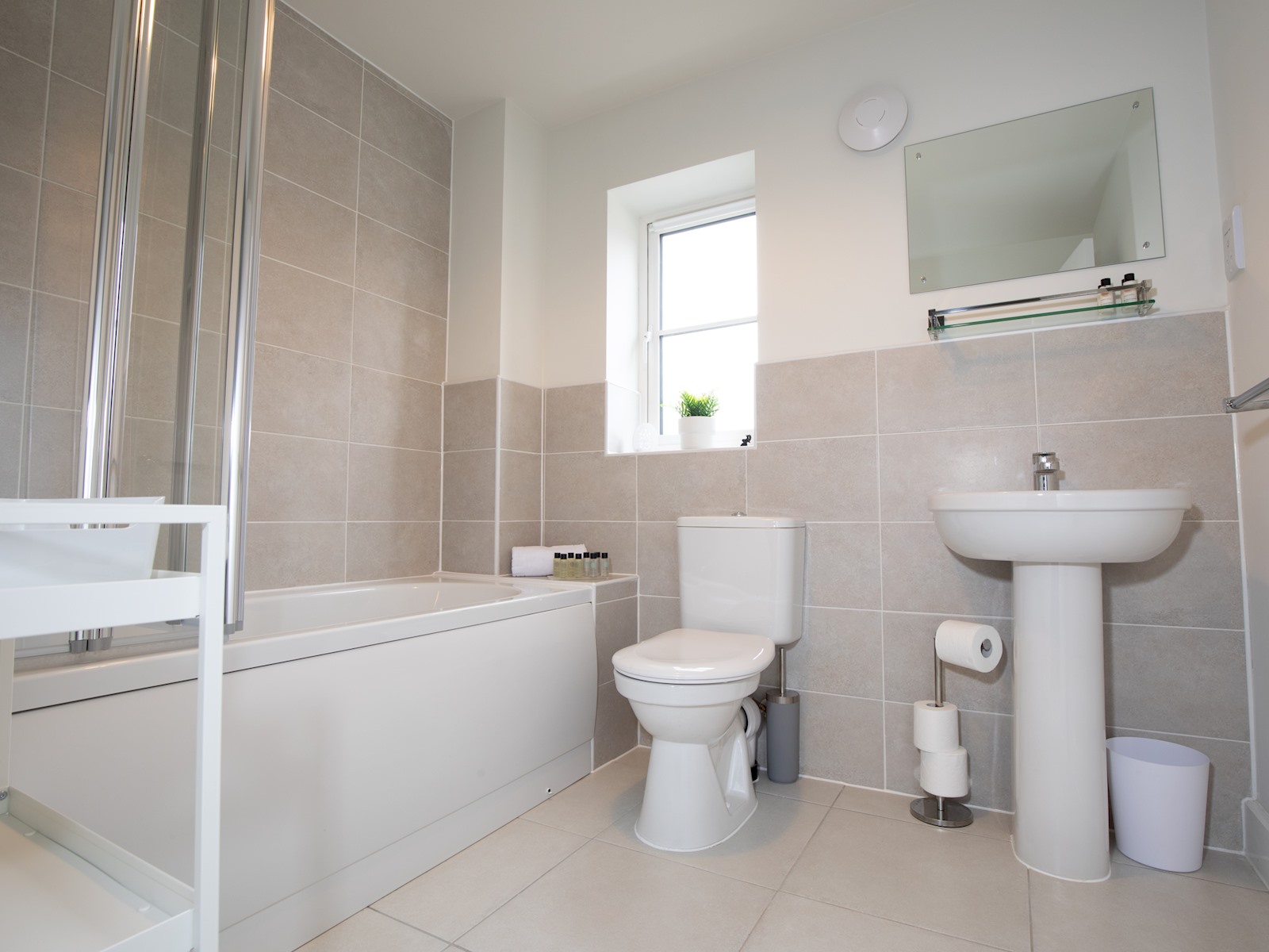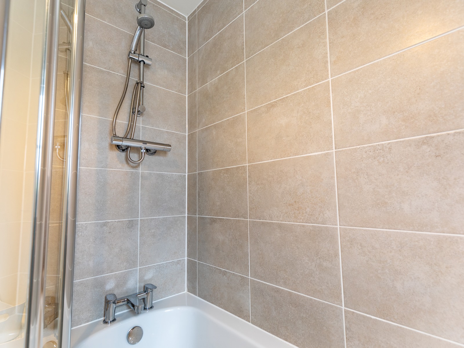 In the bathroom, we have a bathtub, with a shower over the bath.