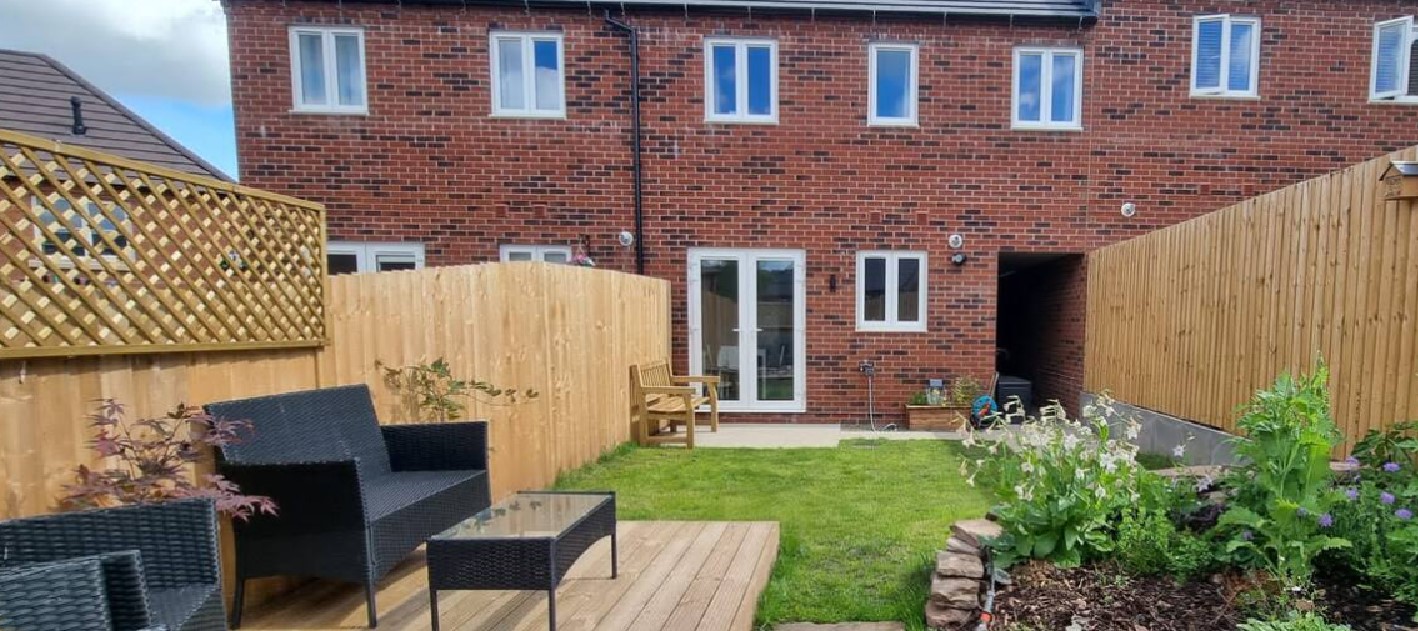 On the ground floor, you walk into a main living area, which leads to an open-plan kitchen dining area, with patio doors out onto the garden. The garden has yet to be finished.