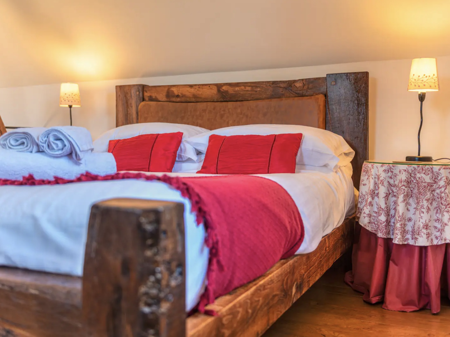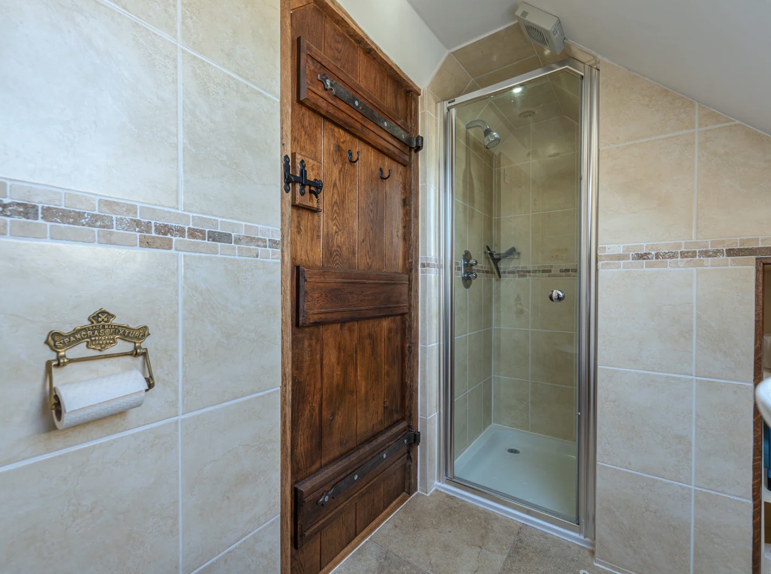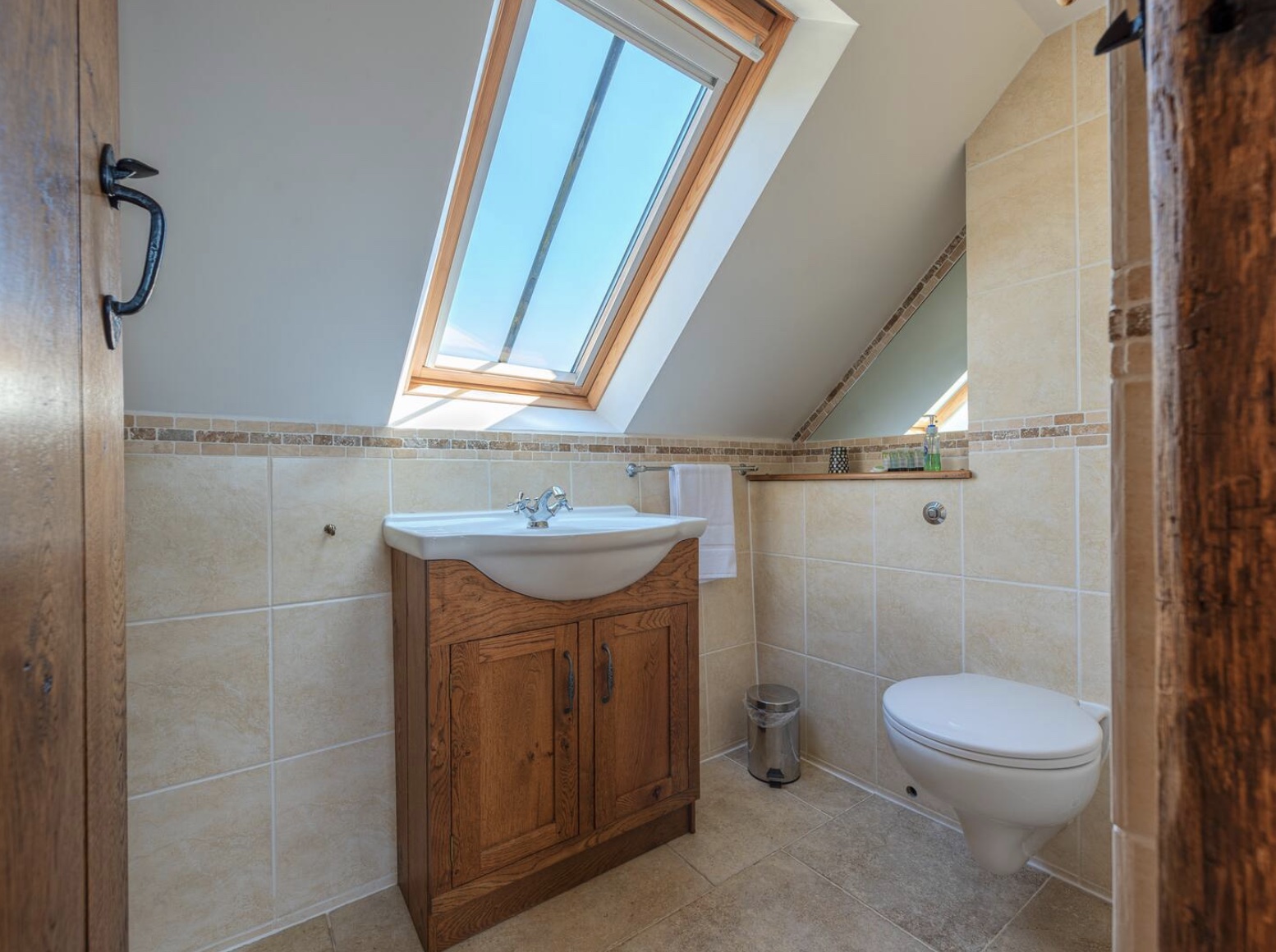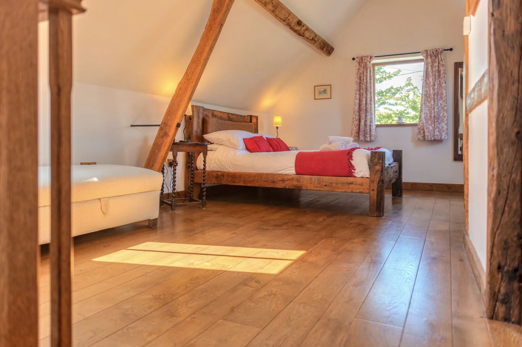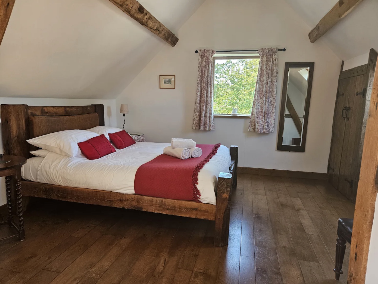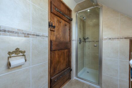Stairs from the lounge go up to the First floor into the large Master bedroom, the dual aspect windows and skylights make this room light and cheerful with Stripped wooden floors and oak beams, and a comfortable King size bed that is made with hotel-quality linen for a perfect night’s sleep. There is a wardrobe, chest of drawers with a mirror and ottoman for plenty of storage, and an ensuite Shower room with Basin and WC which has hotel-style toiletries