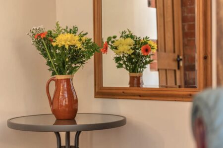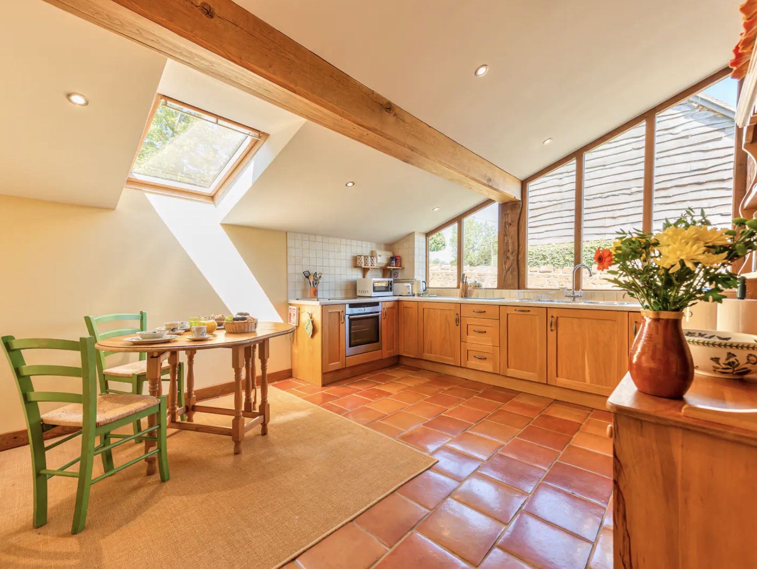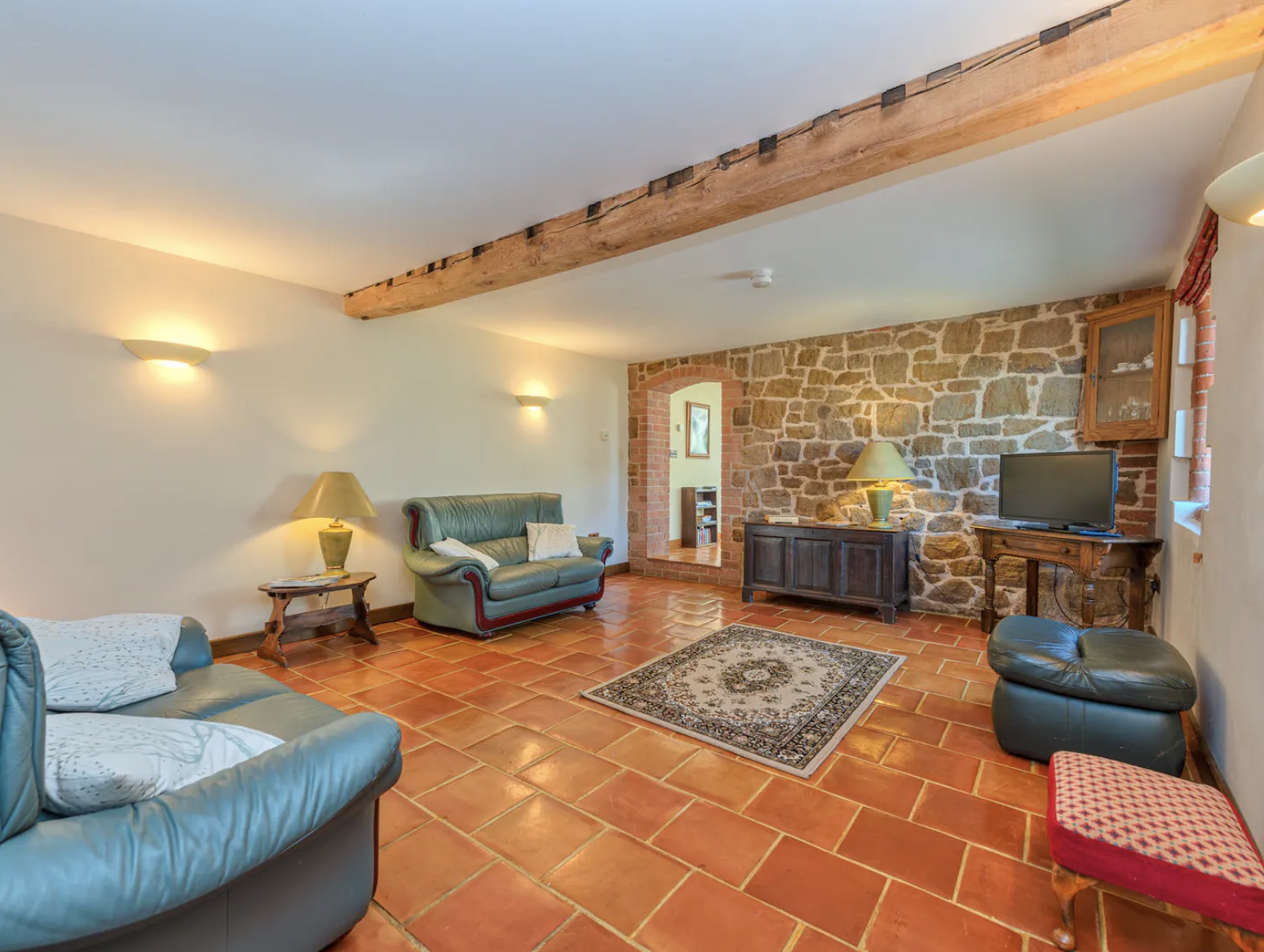 The front door will take you straight into the spacious lounge with exposed stone walls and oak beams where you can settle down to watch the TV with an integrated DVD player or help yourself to one of the books, DVDs, or board games. Our heating is provided using a ground source heat pump and solar energy, allowing us to be environmentally friendly.