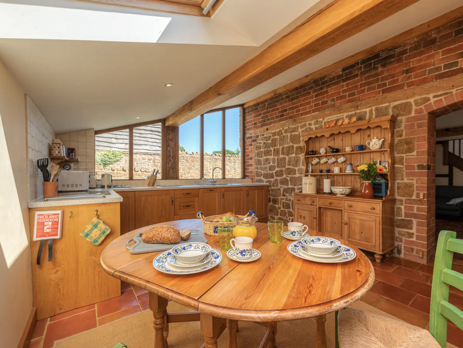 Carry through to the light and airy kitchen where windows line the far wall. The kitchen is fully equipped with all appliances, including Oven, fridge freezer, Microwave, Washer-dryer, and dishwasher, and has a large dining table and French dresser. If you prefer to have your meals outside, there is table and chairs available in the lounge/cupboard, you can sit in the cosy area at the front or relax in the rear garden and take in all of the views.