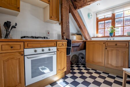 Upstairs we have an open plan kitchen, dining, and living area with original features such as exposed timber beams, and high ceilings giving it a light, airy feel with bags of character.