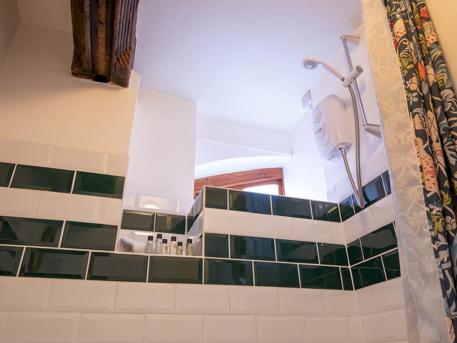 The Coach House Barn is located over two floors. Downstairs we have the bathroom with bathtub and shower over the bath.