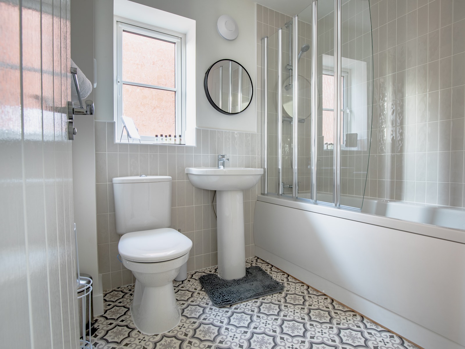 On the first floor is the bathroom with bath and shower and we supply fresh towels and toiletries, including, shampoo and shower gel for you.