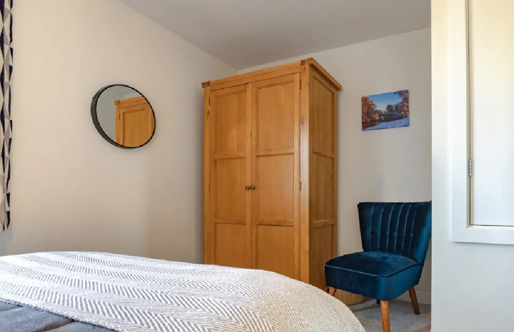 Master bedroom with king-size bed, small wardrobe and drawers and double bedroom with wardrobe space.