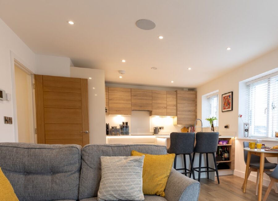 The hub of our apartment is the large modern open plan, kitchen/dining and living room area, where you can enjoy the views of Shrewsbury.