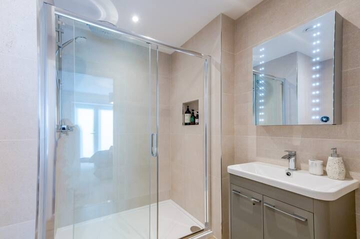 The apartment is brand new and has been designed for today’s modern lifestyle. We have two double bedrooms both with double beds, with the master bedroom having en-suite shower room with walk-in rain shower and plenty of wardrobe space and dressing table.