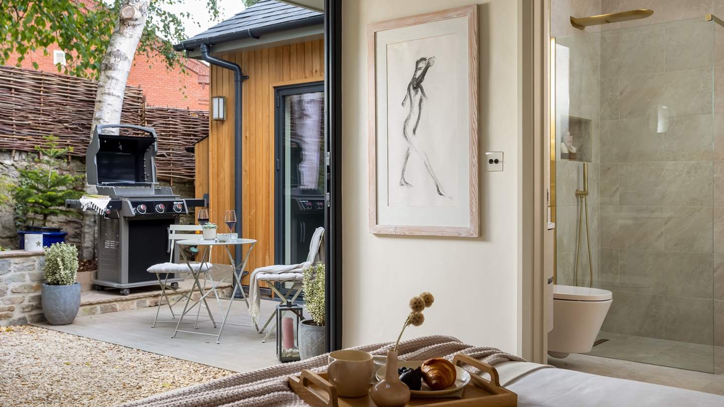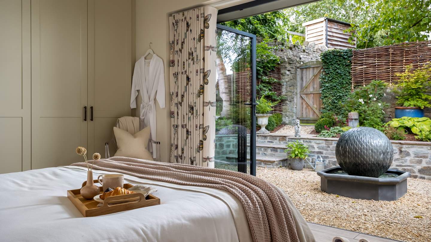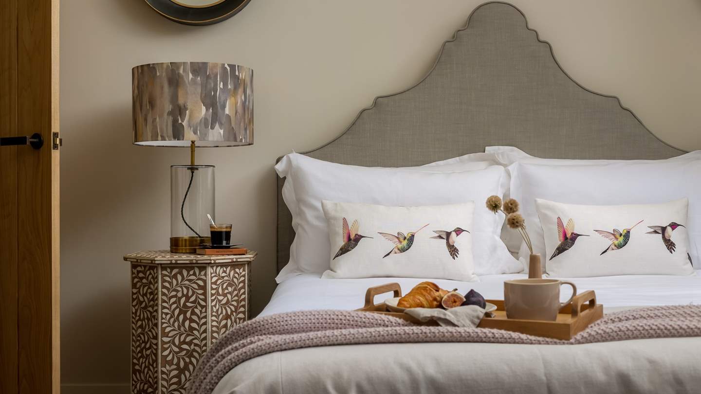 With soothing neutral and blush tones, the heavenly bedroom which opens out into the beautiful courtyard garden through bi-fold doors, is just made for savouring lingering lie-ins. The king-sized bed with a soft grey headboard is swathed in luxurious linens, cloud soft bedding, and charming printed cushions. You will also find two elegantly detailed bedside tables, an occasional chair, and a fitted triple wardrobe offering plenty of storage for your stay.