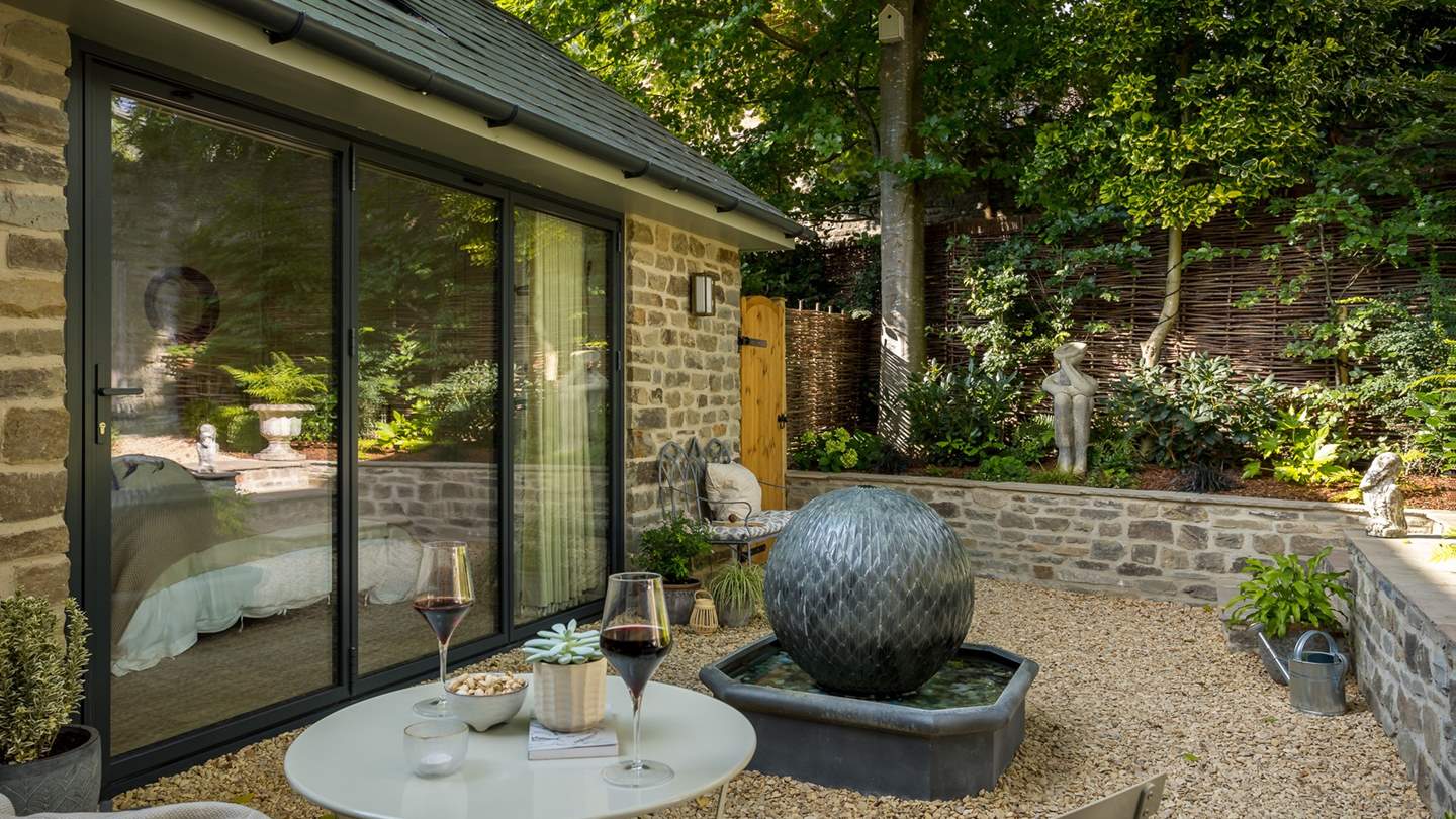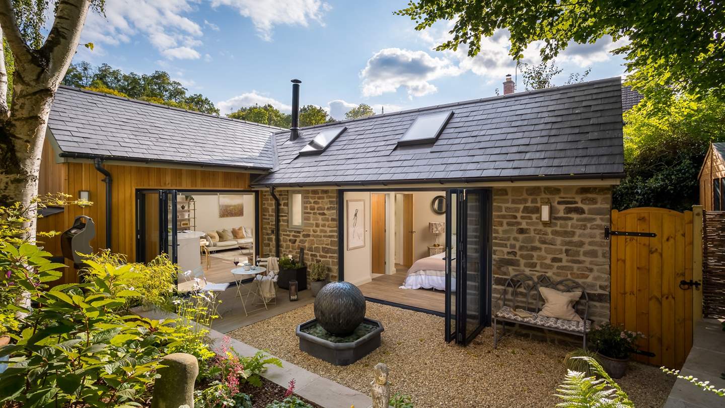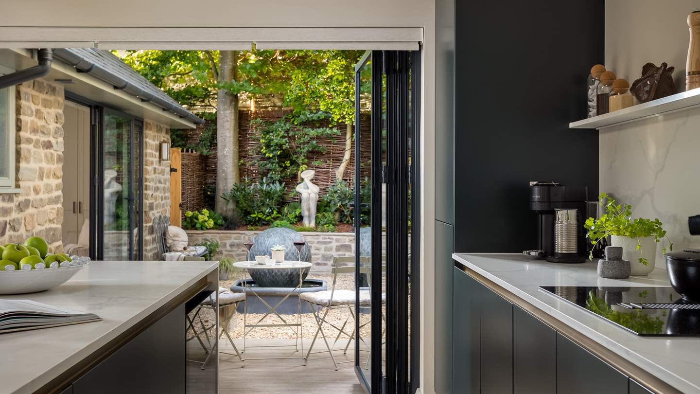 Elegant bifold doors open from the kitchen space, leading out onto the idyllic courtyard garden where a table and chairs rest. On warmer days, open the doors to welcome the outside in whilst creating culinary delights, later retiring to the patio for a glass of wine as dusky skies draw in.