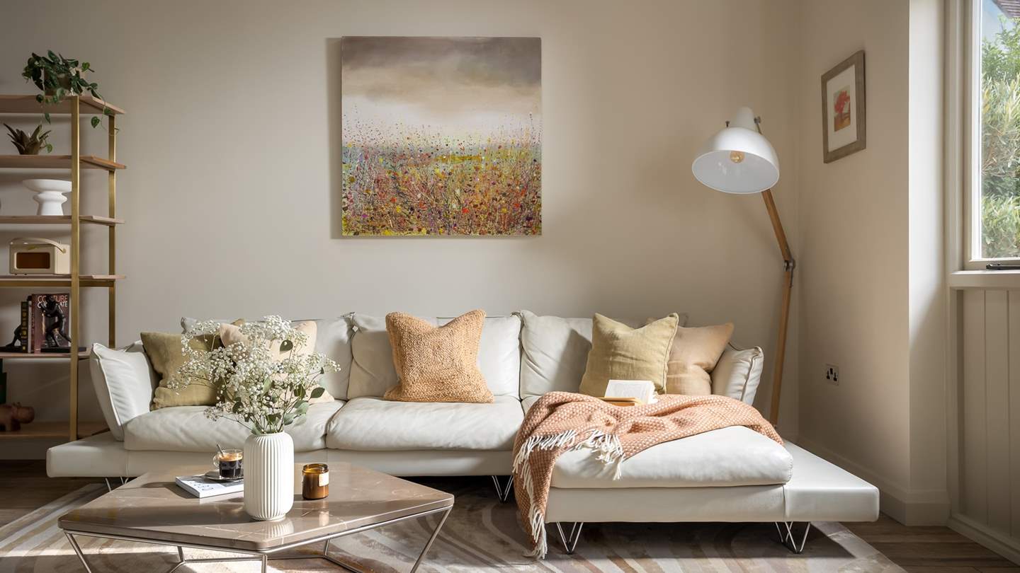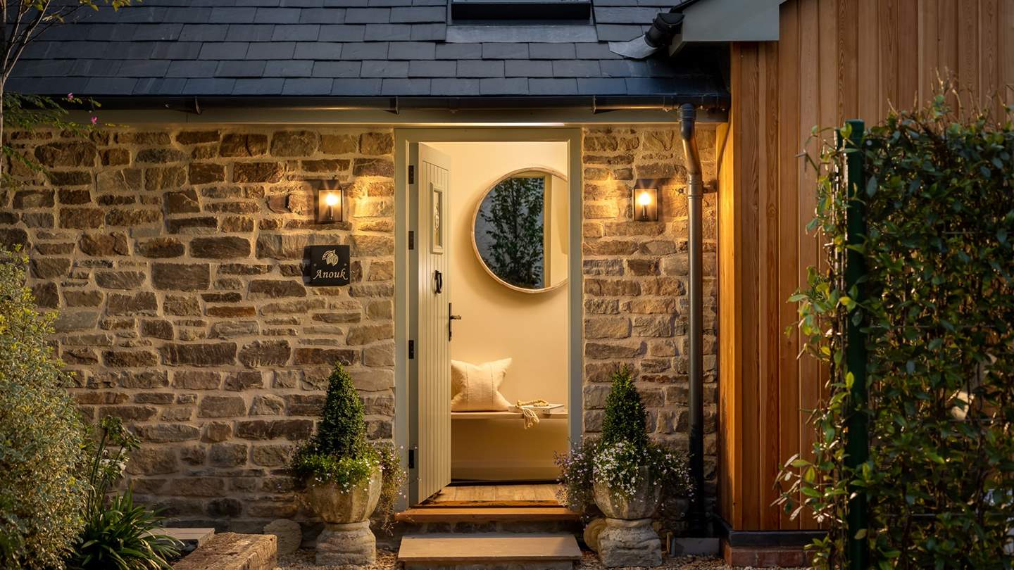 Step inside our divine dwelling into an elegant entrance, leading to the stunning open plan living space where vaulted ceilings and handsome beams form a light, spacious design offering both luxury and comfort. From the considered palette of soft tones, to carefully curated artwork and abstract artefacts adorning this calming space, Anouk is undeniably an aesthetic dream. Settle on the comfy leather couch for film nights with the Smart TV, or simply cosy up together to savour the mesmeric flames of the contemporary wood burning stove. You’ll also find an internet radio with Bluetooth speaker to select the perfect soundtrack for your staycation moments.