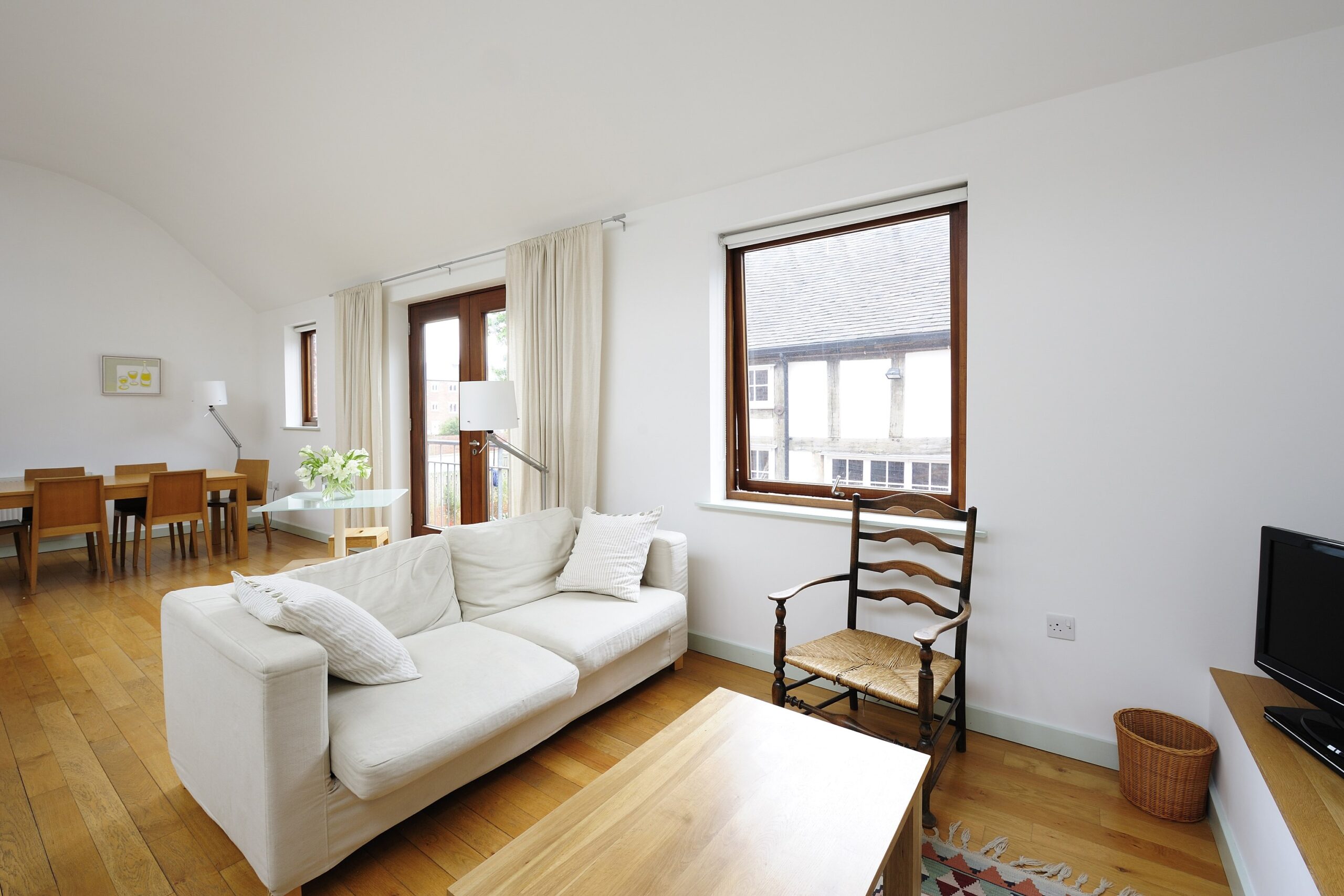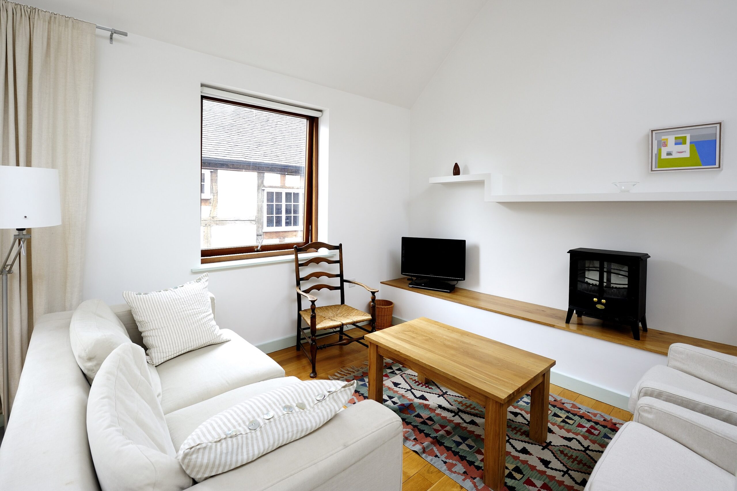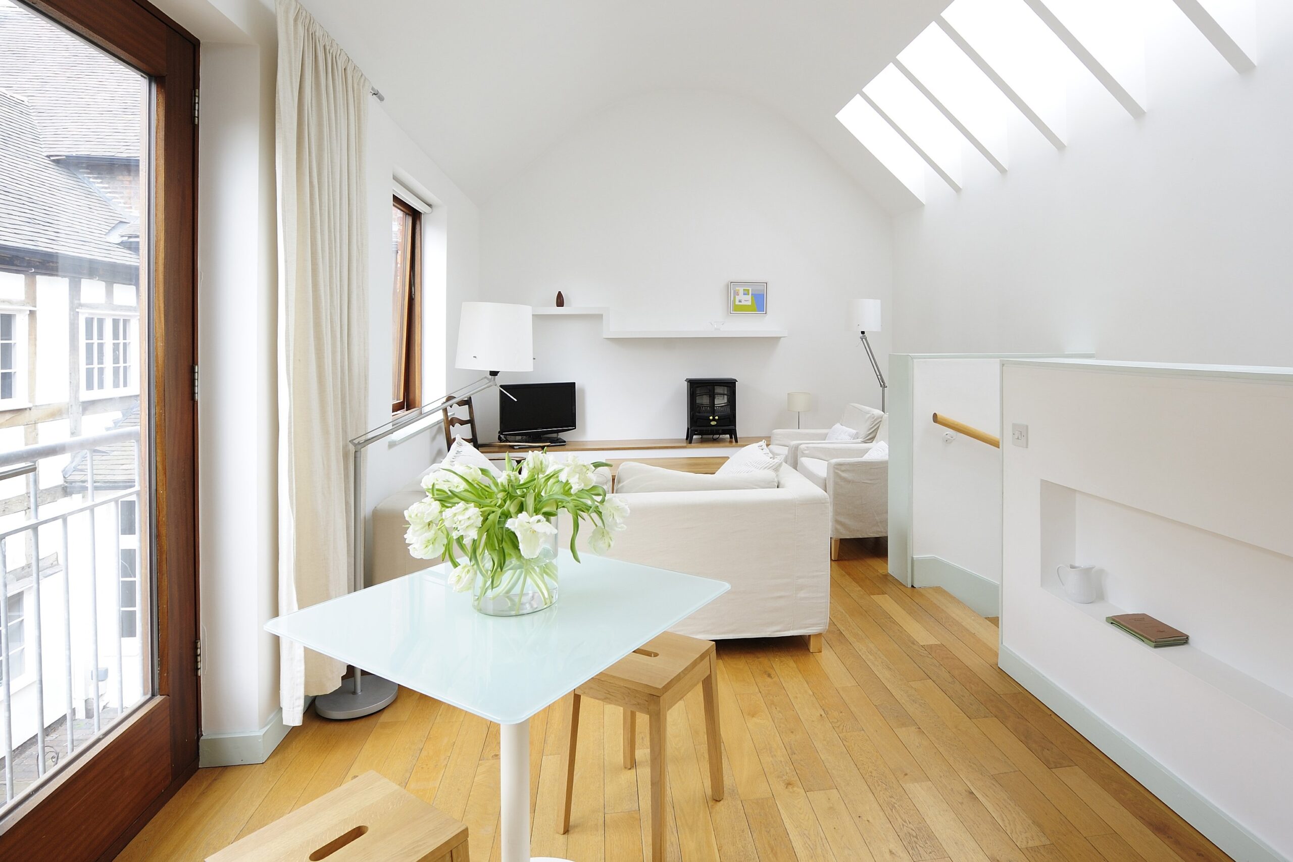 Stables is a gorgeous spacious mews house built on the former stables of the Lion and pheasant hotel, echoing the original stables with a stunning first floor vaulted living, dining room. The unique continuous rooflight creates a living room full of daylight and sunshine, and the double doors with Juliette balcony open up to bring the outside inside! There are solid oak floorboards and rugs throughout the first floor and the furniture is relaxing and comfortable.