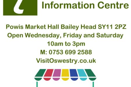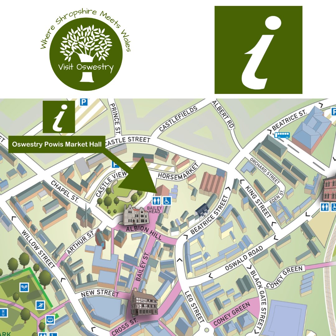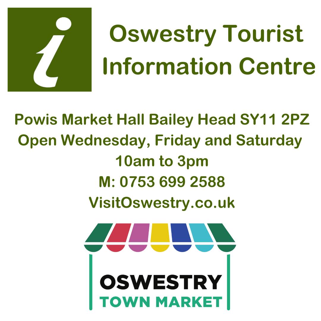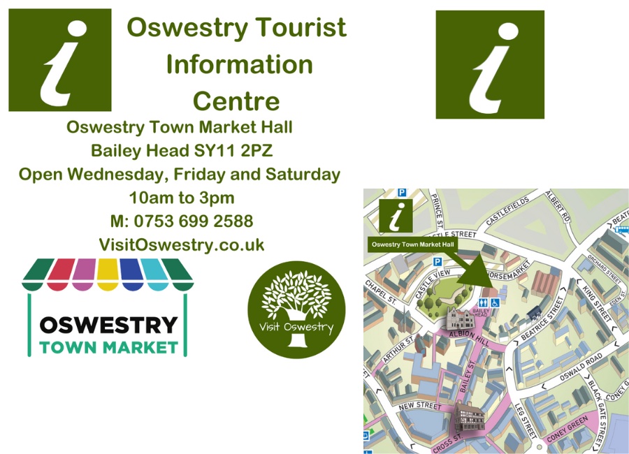 Visit Oswestry Town Tourist Information Centre at Oswestry Market Hall. The Town TIC is open 3 days each week, Wednesday, Friday and Saturday 10 to 3 pm.